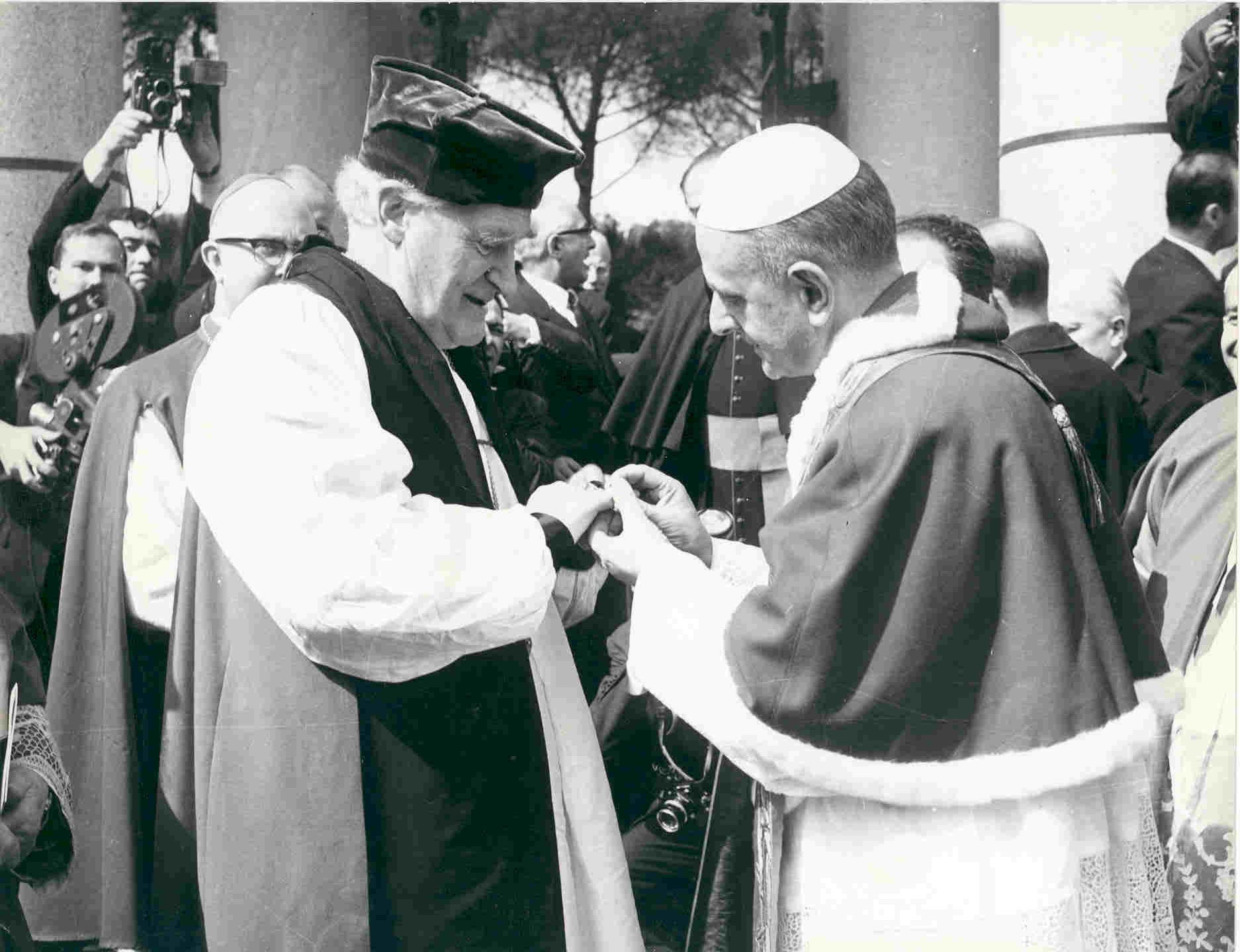 Gallery ID: 63 + more detailsPope Paul VI places his episcopal ring on the finger of the Anglican Archbishop of Canterbury Michael Ramsey (24 Mar. 1966)